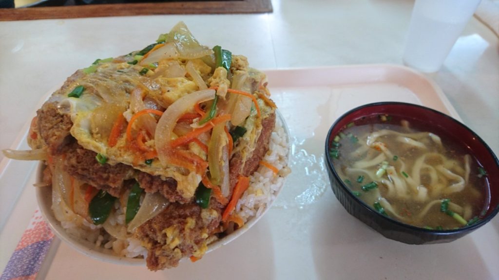 なんとカツ丼を頼むと、メガ盛りのカツ丼に沖縄そばがついてきます。
