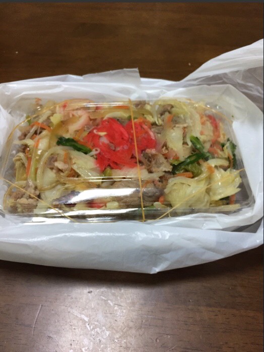 肉野菜炒めの下から見える麺は沖縄そばには珍しい平打ち麺で、もっちりとしてます。合わせて食べると、より箸がすすみます。