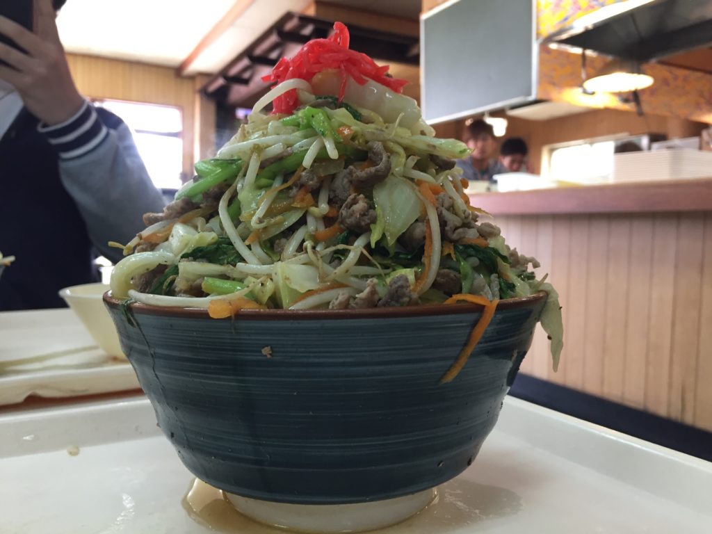 沖縄そばの上にてんこ盛りの肉野菜炒めがのっかったその姿は大盛りで有名なラーメン二郎にも引けを取りません!