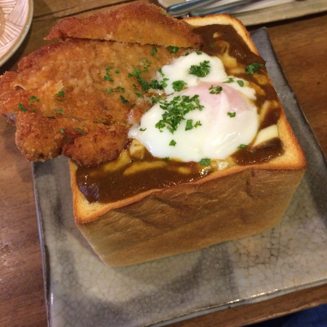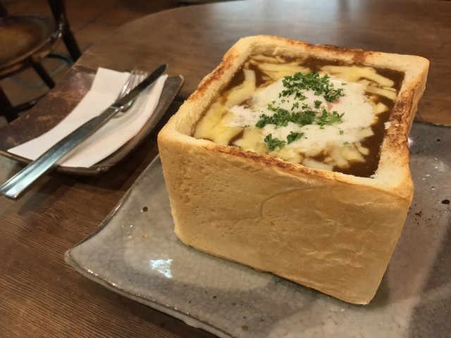 器代わりにした食パンの中にカレーを注ぎ込んだ、なんとも豪快な1品です!