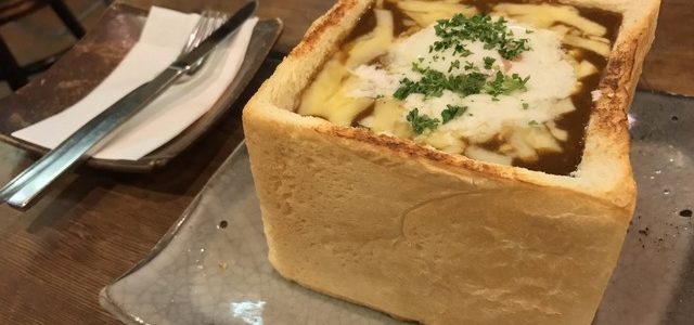 器代わりにした食パンの中にカレーを注ぎ込んだ、なんとも豪快な1品です!