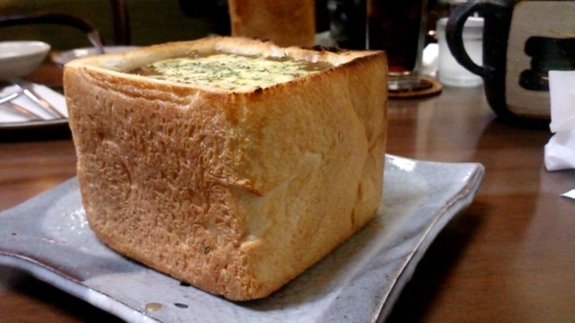 器代わりにした食パンの中にカレーを注ぎ込んだ、なんとも豪快な1品です!