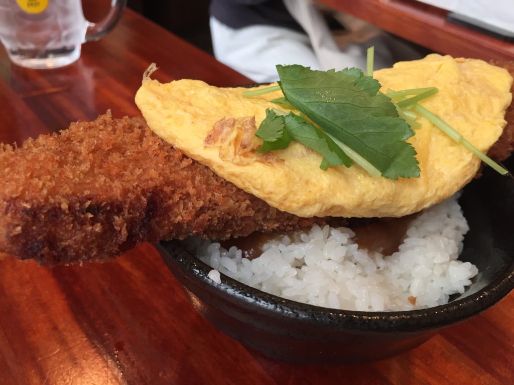 丼からはみ出るくらいの大きさのカツとふわとろのオムレツ!